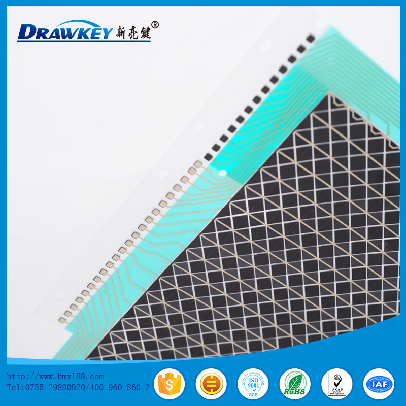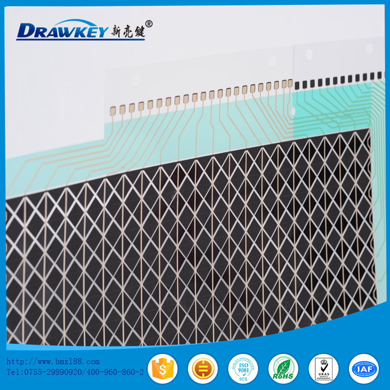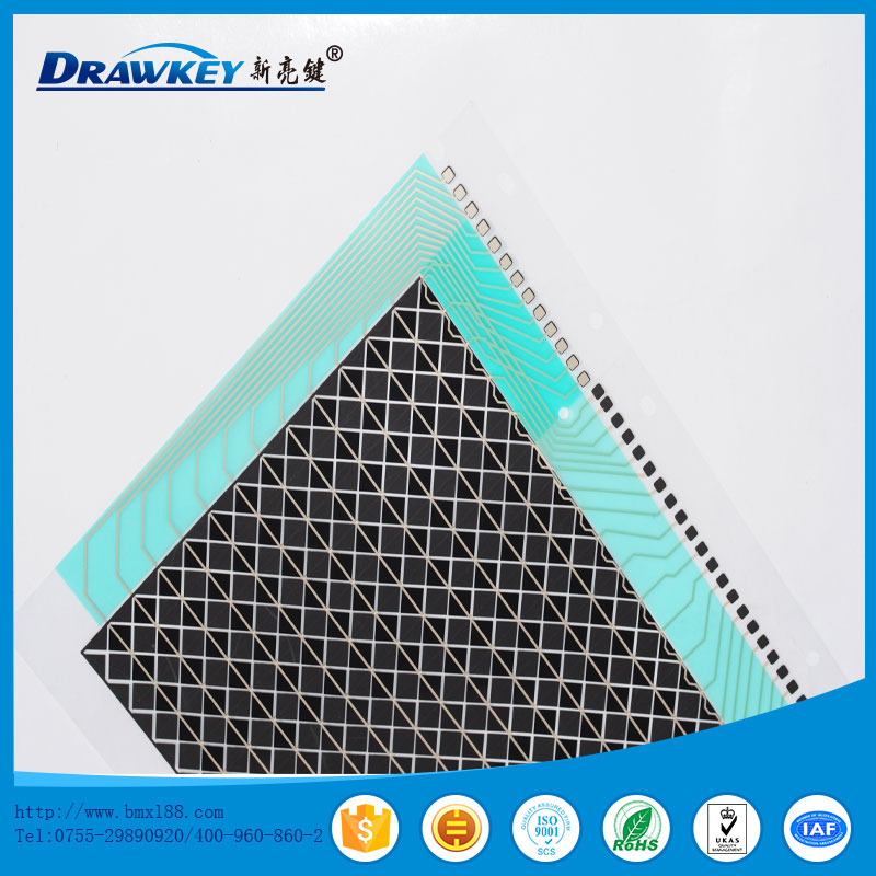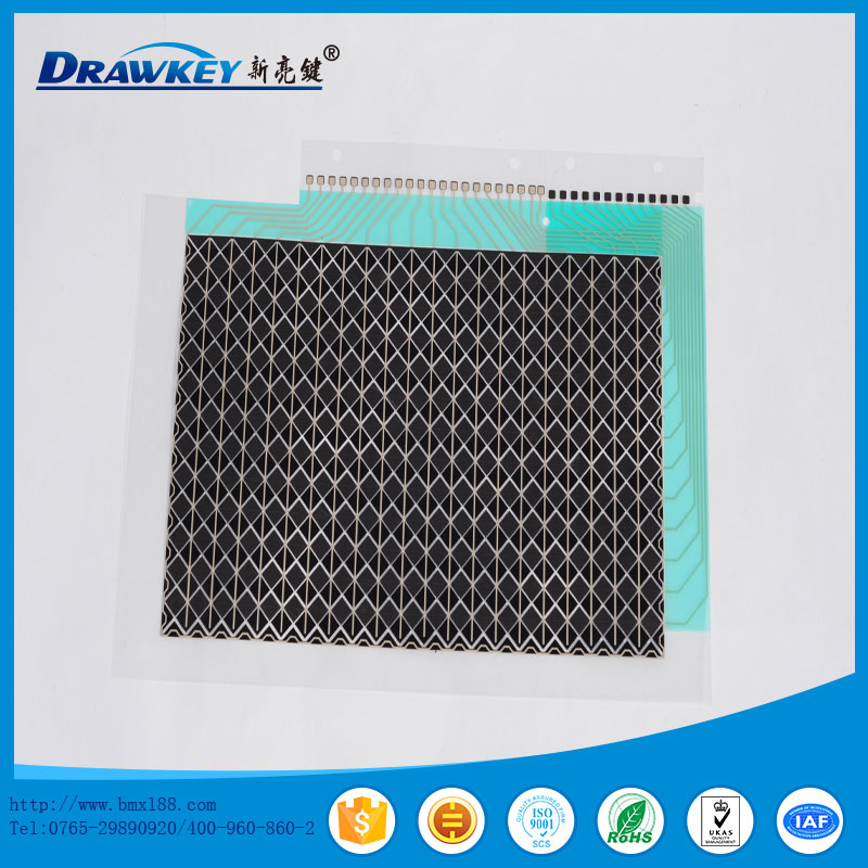 使用PET 印刷银线、碳线,形成薄膜开关按键。电阻值小于100Ω。符合ROHS标准。