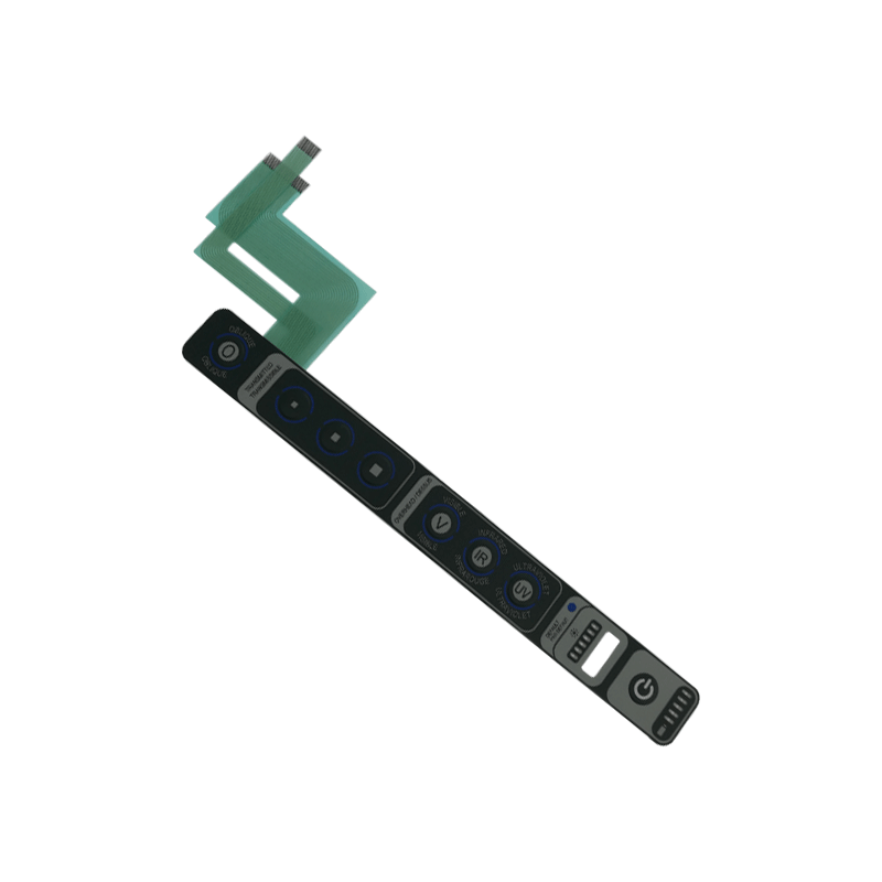 带LED薄膜开关是具有一定柔性的绝缘材料层和导电材料层组成的,一种多层结构非自锁按键开关。它集按键开关、面板功能标记、读数显示窗、指示灯透明窗、开关电路引出线以及常规面版上所要标注的文字、符号、装饰内容为一体,从而构成电子操纵系统的总成。