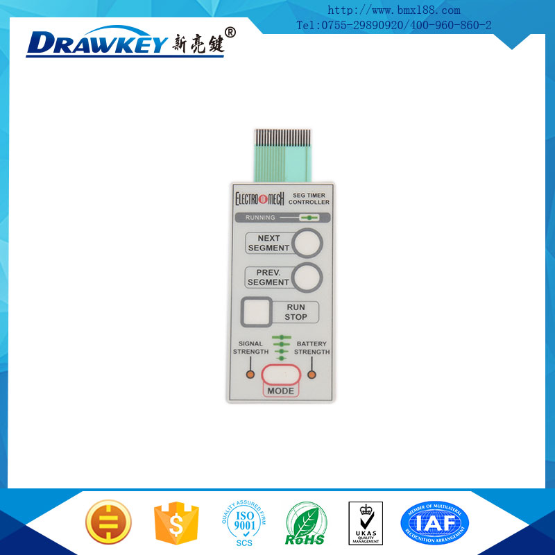 带按键薄膜开关面贴是整体密封结构,开关的触点不受有害气体的侵蚀,不易氧化,具有防水防尘的特点,从而更适用于各种恶劣的环境。
