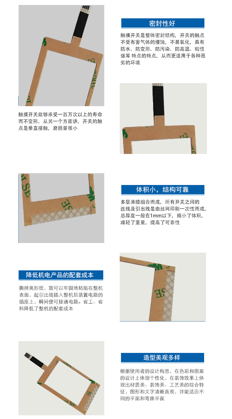 电阻电容触摸屏是集按键开关、面板功能标记、读数显示窗、指示灯透明窗、开关电路引出线以及常规面版上所要标注的文字、符号、装饰内容为一体,从而构成电子操纵系统的总成。薄膜开关是采用丝网印刷技术加工而成的,不仅具有对机电产品控制面板外观的装饰作用,更具有操纵整机电路完整的功能作用,是装饰与功能集于一体。